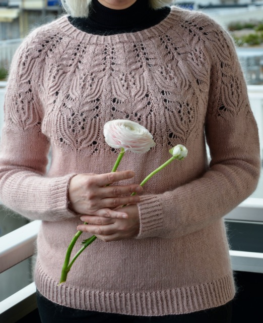 Ohjeessa myös hihoihin neulotaan tuota kaunista pitsikuviota, mutta minä päätin jättää ne tekemättä. Kaunis puserosta tuli näinkin. Sitä paitsi hihoissa pitsin tai kirjoneuleen tekeminen ei ole kovin rentouttavaa.